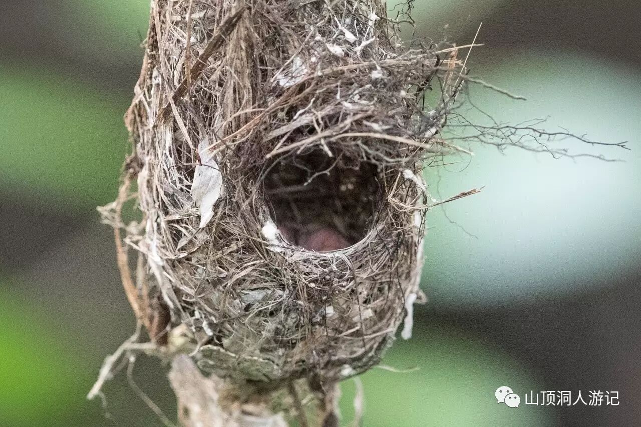 今天是出壳后大约第十五天,早上我稍微犯了一点懒,离家晚了一点,八点十几分到林子里时,已经鸟去巢空了!树林中亮起来的时间大约是七点半钟,花蜜鸟夫妻通常在这个时间开始给孩子们喂食,所以如果我早到半个小时,可能就能够看见小鸟离巢起飞!离巢是小鸟最重要的时刻之一,我苦苦等待了一个多星期,却就这样错过了,遗憾极了。