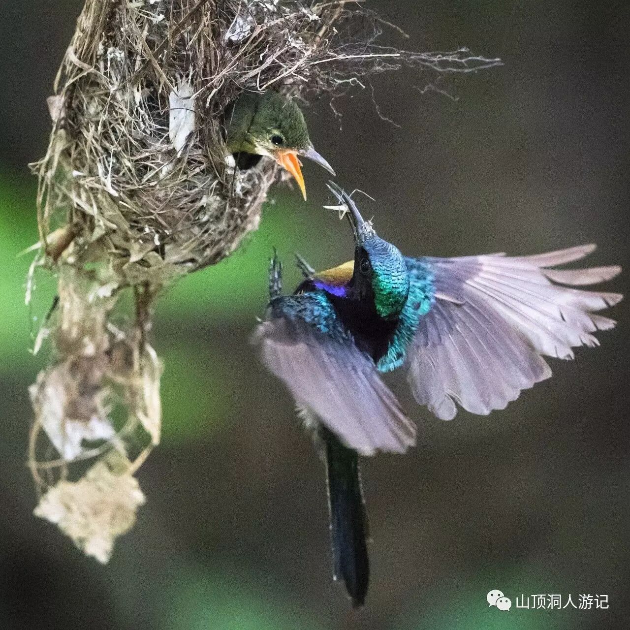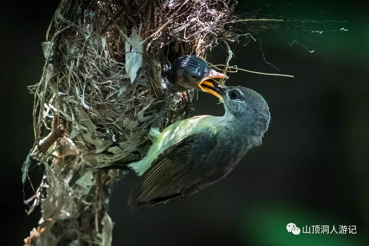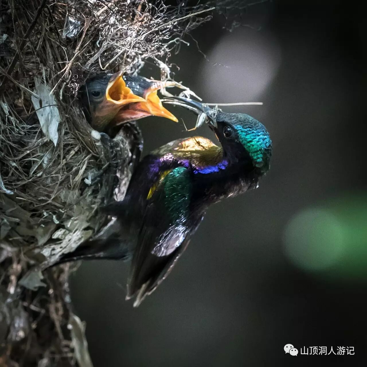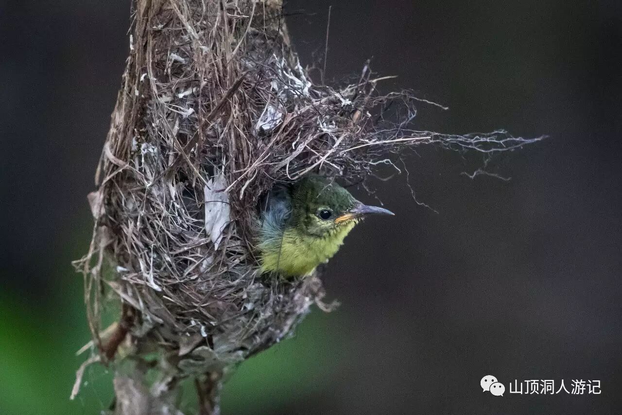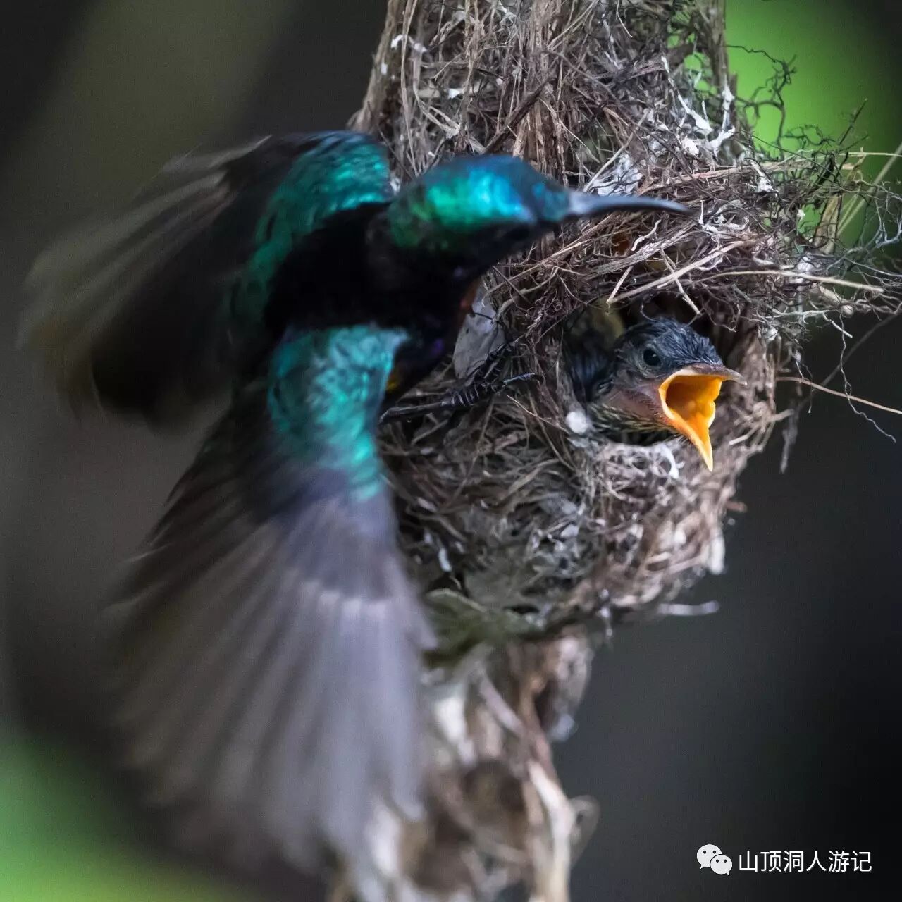 不过,观察差不多一周后,我发现鸟爸爸干活也多起来了,回家喂食越来越频繁,逐渐能和鸟妈妈达到一比一;在小鸟离巢起飞之前,甚至超过了鸟妈妈,成为喂食主力。我推测,可能在小鸟初生的时候,主要喂食花蜜,鸟妈妈可以对付;到小鸟长大一些后,需要喂食昆虫蜘蛛这类食物了,窝里又是两张小嘴,鸟妈妈忙不过来,鸟爸爸必须来帮忙了。而且,似乎鸟爸爸更会捕虫,带回的虫子通常比妈妈带回来的更大、更好。