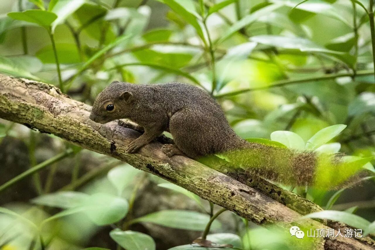 一天,正在拍摄时,来了一只出生不久的小松鼠。松鼠是林中居民,没什么奇怪的,而且这只小松鼠的家就在不远处,一家子常在附近活动。但这一次它却和往常不同,在离鸟窝不远的一棵树干上趴了好久,偶尔抖抖尾巴,偶尔东张西望,就是不肯离开。花蜜鸟两口子都不再回巢了,落在松鼠左右两侧的树枝上,密切监视它的一举一动。